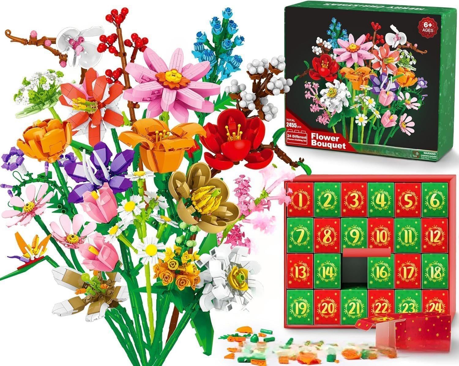 - 1. Advent Calendar 2025 Flower Bouquet Building Blocks: Our building block flower advent calendar set features 24 numbered small boxes, each concealing a unique building block flower. From December 1st to 24th, open one box daily to collect a new flower piece, assembling them to build anticipation and joy leading up to Christmas.